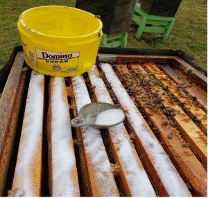 We are tempted to ignore all advice and open them up just to slip in a little fondant. Don’t do it! The thaw will come. The temperature will hit close to 50 and that’s your green light. But even then, don’t separate any boxes and crack the propolis seal they have made against the weather. By end of February the queen will have sensed the light change and will be laying eggs. Now the cluster has to work harder because the new young bees have to develop at 92 degrees. And this is when the honey begins to disappear fast because the adult bees have to eat more to create that heat and they have to also feed the young. No liquid feed yet, but a fondant will likely help them. There are many recipes online. Here’s one. https://www.honeybeesuite.com/how-to-make-fondant-from-table-sugar/ Or you can spread some white granulated sugar on the top bars as shown in the picture.
